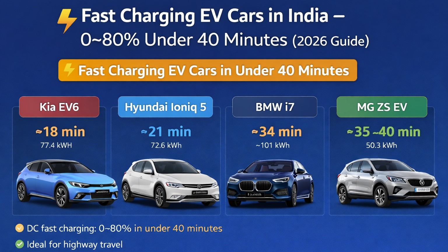 Looking for fast charging EV cars in India? Explore electric cars that charge 0–80% in under 40 minutes with powerful batteries, long range, and DC fast charging support.
